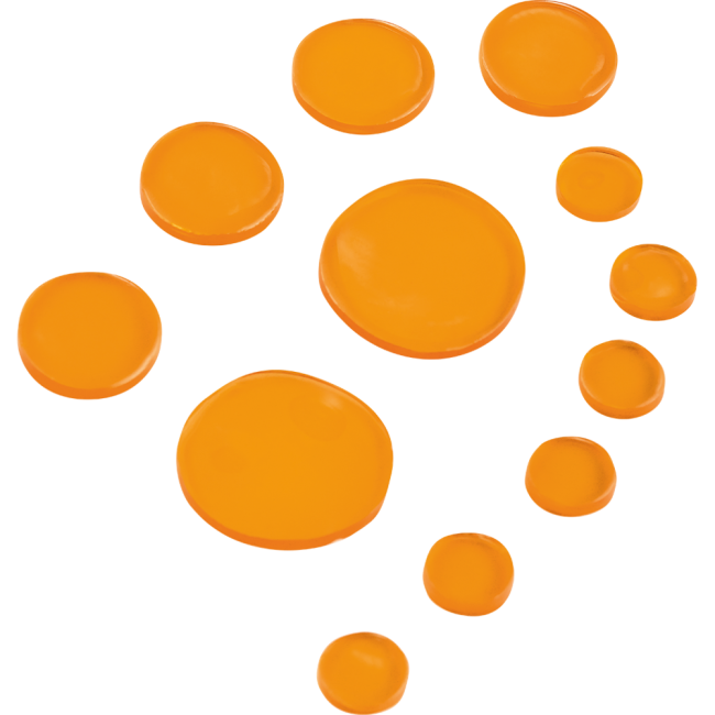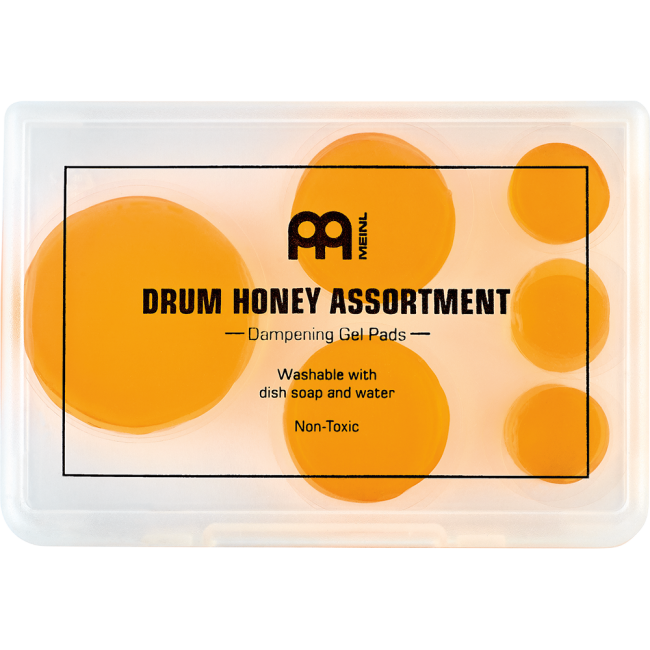 Meinl Drum Honey instantly transforms your drum sounds into a warm and sweet one with practically no effort. They can be removed from any surface as needed. Vital for session drummers and studio engineers as well as being used in houses of worship and venues where sound control is needed. Drum Honey is washable by using a drop of dish soap and water. Let them air dry (no direct sunlight), and their stickiness will recover. The Meinl Drum Honey is non-toxic. The Meinl Drum Honey Assortment includes 12 dampening gel pads: 6x small in 0.6"; 4x medium in 1"; and 2x large ones in 1.4".